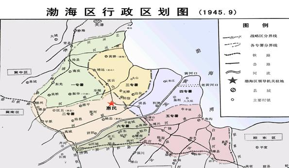 渤海区于1944年1月由清河区和冀鲁边区合并而成。版图面积约54000平方公里,东至胶莱河,西抵津浦线,南迄胶济路,北止天津南,东北濒临渤海;最多时辖6个地委、专署、军分区,计55个县(市、区),总人口1114万。渤海区党政军领导机关曾长期驻滨州市境内。所辖区域曾几经调整,涉及现山东省滨州市、东营市、潍坊市、淄博市、济南市、德州市、河北省沧州市和天津市南部部分县、区。1950年5月因形势发展的需要,渤海区胜利完成了历史使命而光荣撤销。