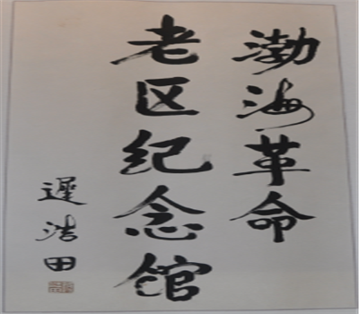 渤海革命老区纪念馆书画堂内悬挂的迟浩田上将题写的馆名。