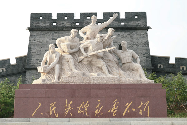 人民英雄群雕坐落于纪念广场北端,正面刻有“人民英雄永垂不朽”,背面刻有“渤海区概况”铭文。